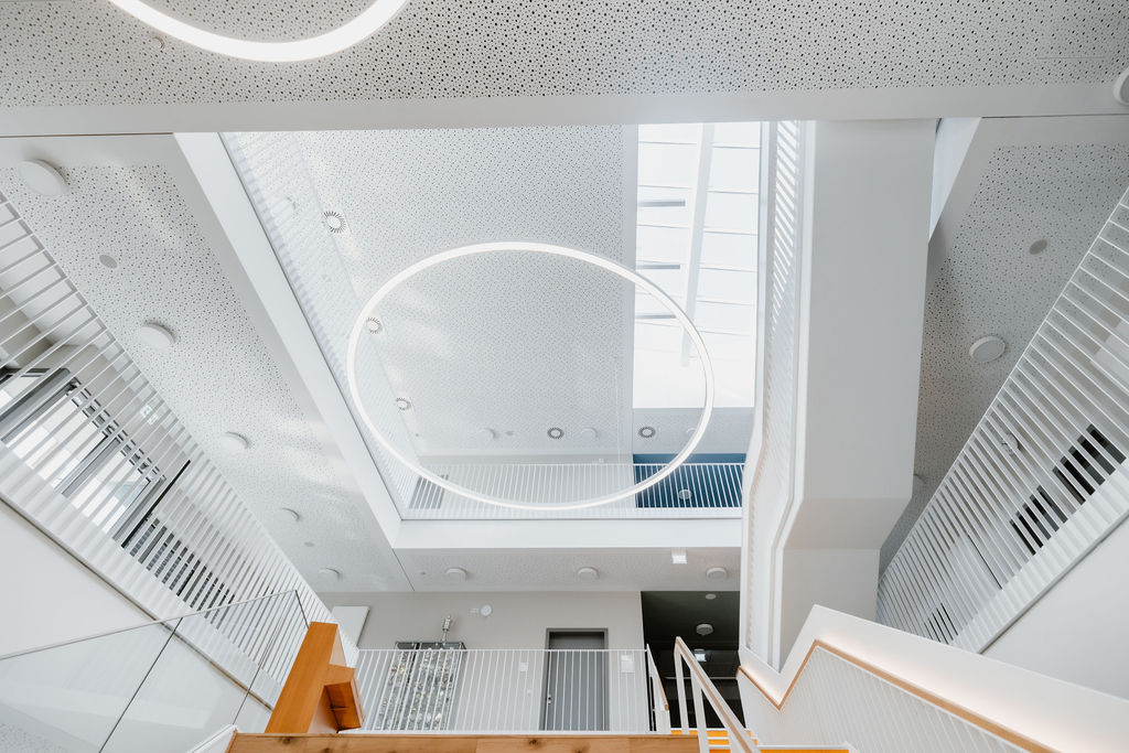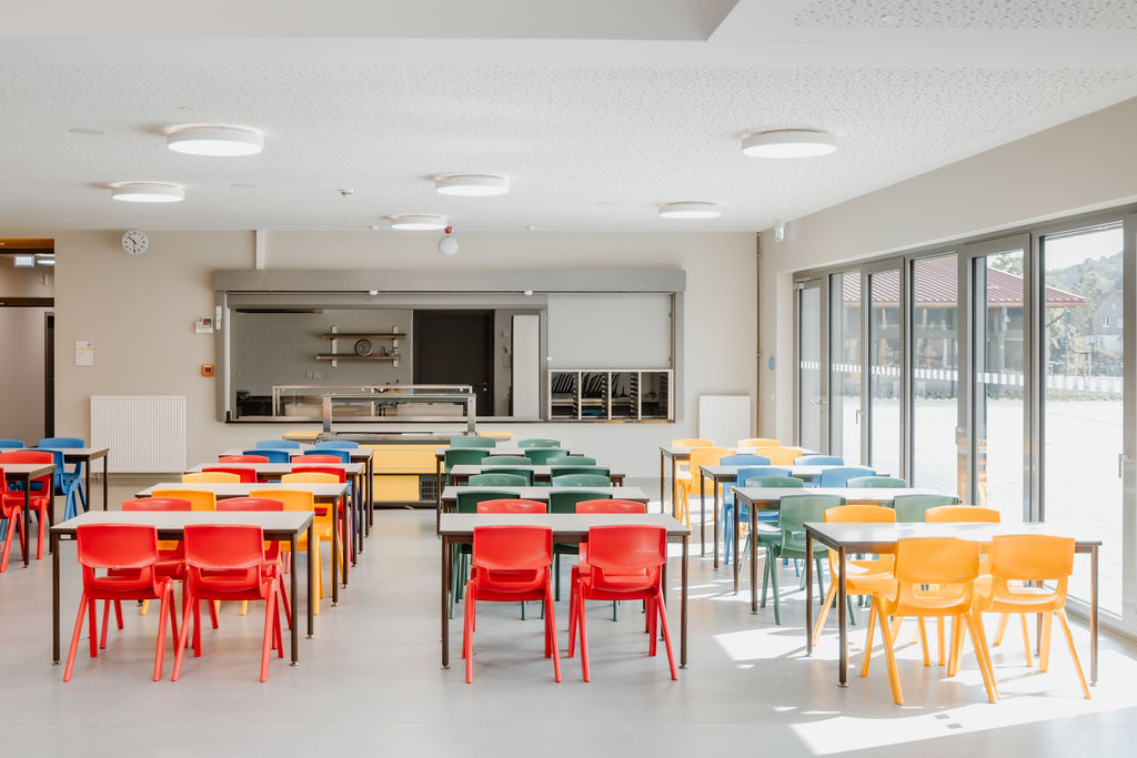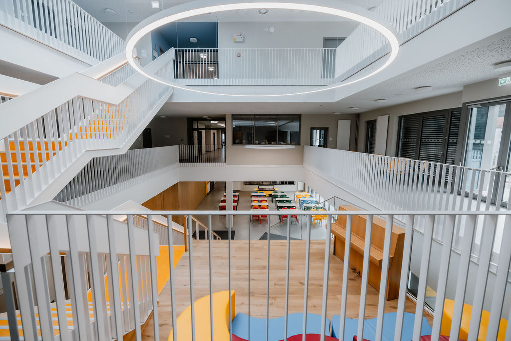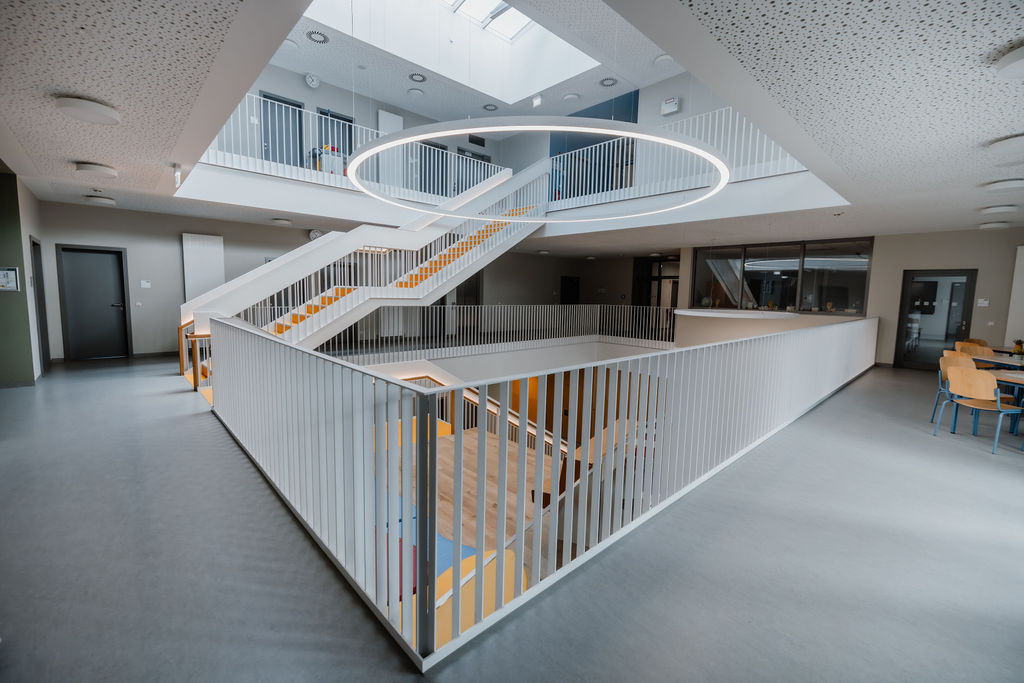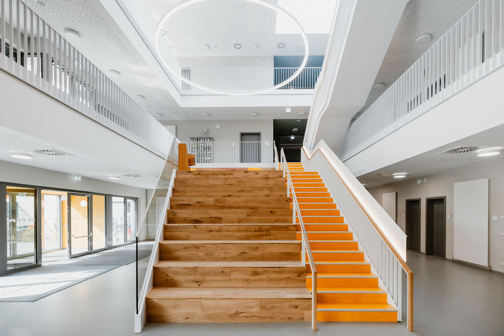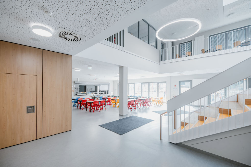 Die Idee der neuen Schule war in vielerlei Hinsicht Neuland. Grundsätzlich erhält die Schule eine Klassenraumstruktur. Doch die Anforderungen an Schulneubauten ändern sich. Große Kommunikationszonen als Begegnungsstätten ergänzen klassische Lernkonzepte. Daher haben wir die funktionelle Planung der Schule in enger Zusammenarbeit mit der Schulleitung, den Lehrer*innen sowie Elternvertretern erarbeitet und für alternative pädagogische Konzepte außerdem breite Lernflure und offene Lernbereiche im Forum geschaffen.