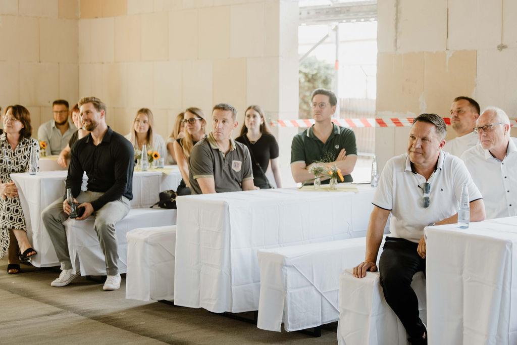 Nicht alles ging reibungslos, Unstimmigkeiten im Baugrund waren zu beseitigen und eine Grundwasserabsenkung war zu organisieren. Durch die zielführende Kommunikation aller Beteiligten konnten die zeitlichen Auswirkungen vorgenannter Ereignisse minimiert werden, so dass wir heute symbolisch den letzten Nagel in den Dachstuhl schlagen können.