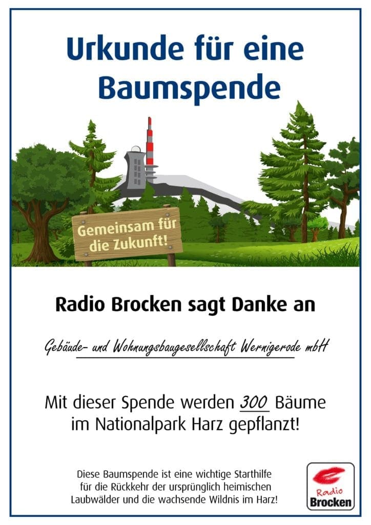 Durch Klimawandel, Unwetter und Borkenkäfer lichten sich die Harzer Wälder immer weiter. Um diesem starken Negativtrend entgegenzuwirken, hat Radio Brocken die Aktion „Baum-Schenken“ ins Leben gerufen.