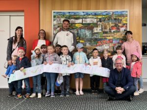 Mitgebracht hatten die Kinder einen selbst gestalteten Fries, wie sie sich das kinderfreundliche Wohnen der Zukunft und ihre Traumhäuser vorstellen. Bei der Übergabe dankten die Erzieherinnen Kathleen Gifhorn und Stephanie Rust der GWW für die freundliche Aufnahme und den interessanten Vormittag. Kathleen Gifhorn: „Ich denke, die Kinder haben einen guten Einblick bekommen, was eine Wohnungsverwaltung alles zu tun hat und welche Menschen hinter all der Tagesarbeit stecken. Davon werden alle sicher noch lange sprechen“.