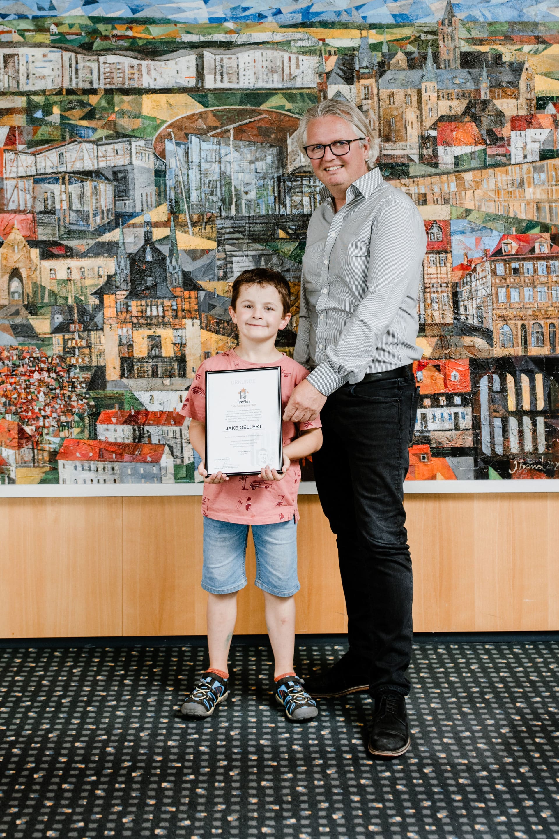 Herein kam dann in den großen GWW-Sitzungssaal ein achtjähriger Junge, der kleine Jake Gellert. Zur Unterstützung brachte er seinen Bruder und seine Mutter mit.