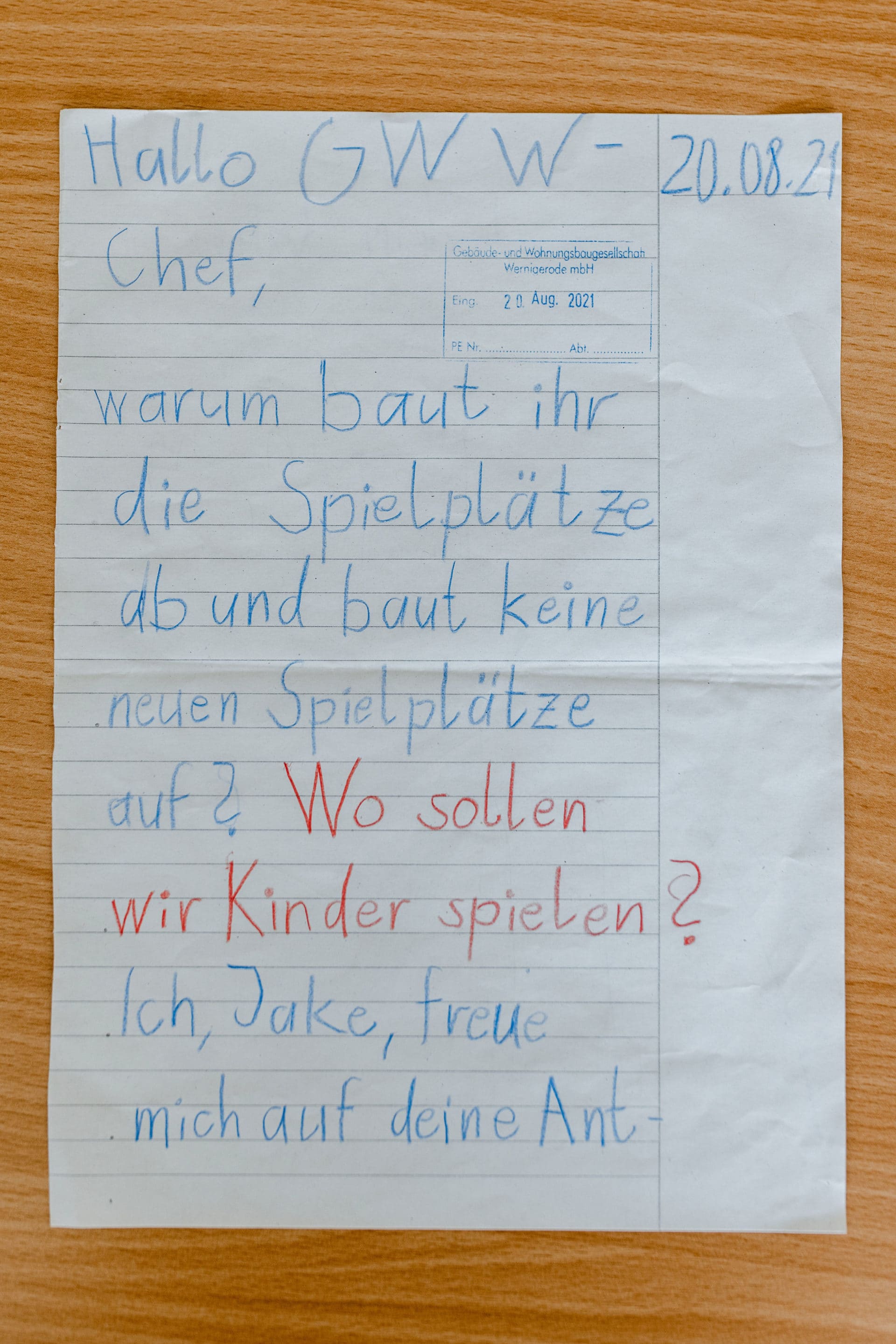 Kleine Ursache. Große Wirkung. Jakes Brief erreichte die GWW am 20. August 2021. Kurz darauf begann im Haus bereits die Planung für den neuen Spielplatz an der Elise-Crola-Straße.