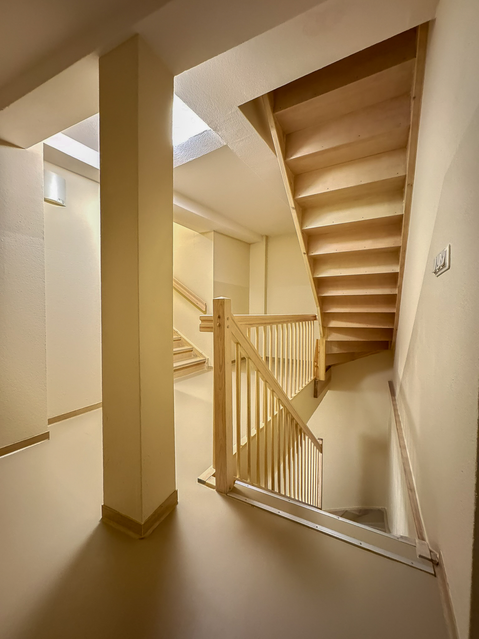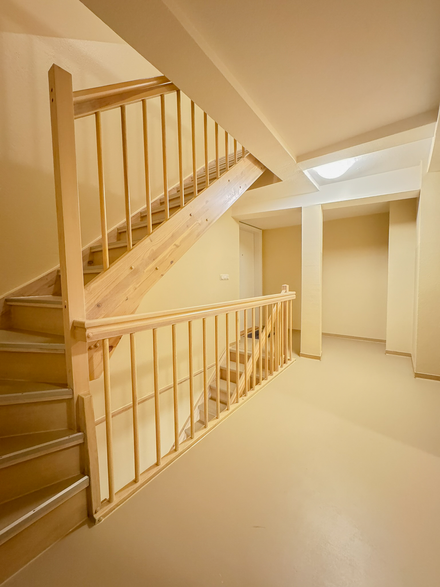 Zudem erfolgte, in Abstimmung mit dem Denkmalschutz, die Erneuerung des Fußbodenbelags auf den Treppen und Fluren der drei Etagen des Wohnhauses. Abgerundet wurde die Sanierung durch die Neugestaltung der Treppenhauswände. Ein frischer, heller Farbanstrich sowie eine bis auf 1,5 Meter Höhe aufgebrachte, abwaschbare Beschichtung erhöhen nicht nur die Ästhetik, sondern auch die Alltagstauglichkeit und Langlebigkeit der Oberflächen.