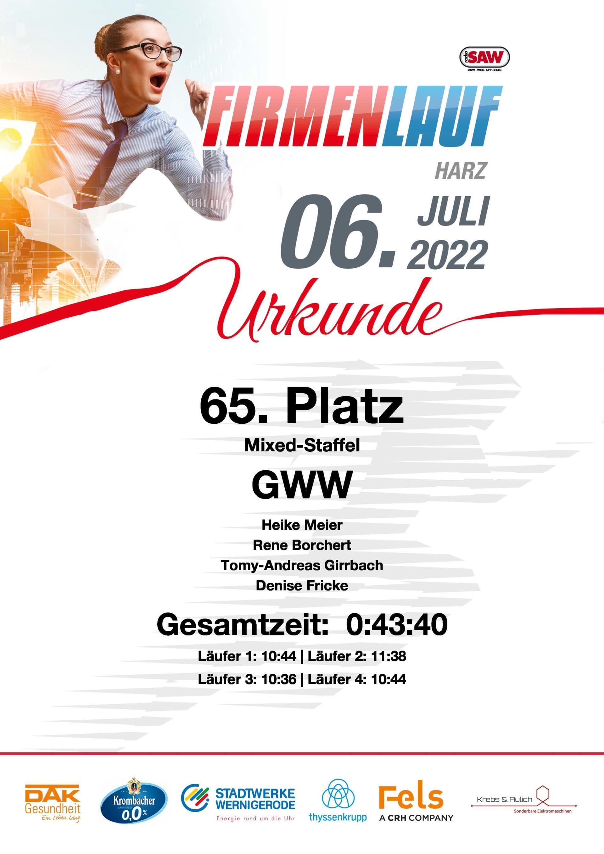 Von 121 Teilnehmern in der Kategorie „Mixed“ belegte unser Team den 65. Platz mit einer Gesamtzeit von 43:30 Minuten.